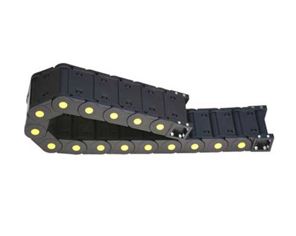 (3)单元链节由左右链板和上下盖板组成,拖链每节都能打开,装拆方便,不必穿线,打开盖板后即可把电缆、油管、气管、水管等放入拖链。