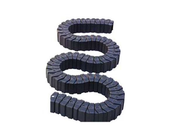 (3)单元链节由左右链板和上下盖板组成,拖链每节都能打开,装拆方便,不必穿线,打开盖板后即可把电缆、油管、气管、水管等放入拖链。