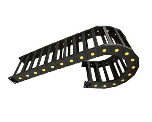 (3)单元链节由左右链板和上下盖板组成,拖链每节都能打开,装拆方便,不必穿线,打开盖板后即可把电缆、油管、气管、水管等放入拖链。